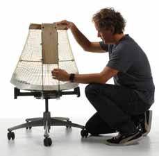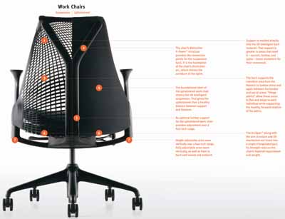 Our work with Yves Béhar achieved a breakthrough in seating technology. Support is molded directly into the 3D Intelligent back material. The suspension material is stretched from the Y-Tower at the back of the chair just as cables are stretched from the towers of a suspension bridge. The tension is greater in the transition areas, from the thoracic to the lumbar areas and between the lumbar area and sacrum. "Hinge points" allow these areas to flex and support the healthy, forward rotation of the pelvis. At the same time, less tension in other parts of the back encourages a full range of seated movement
