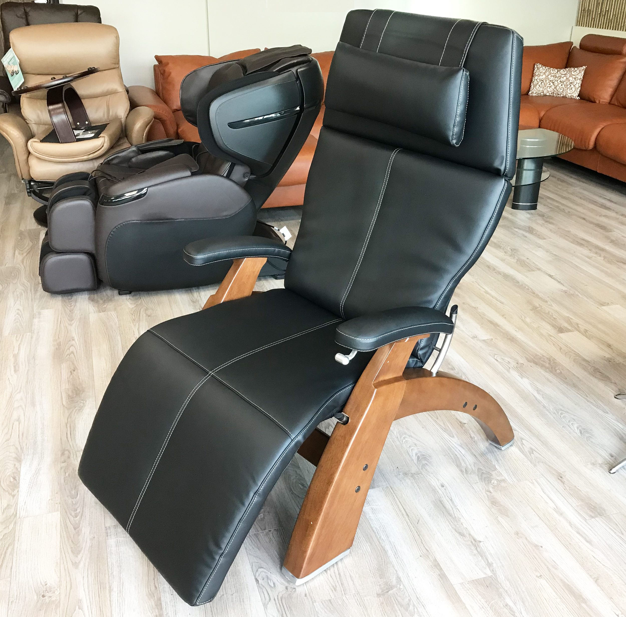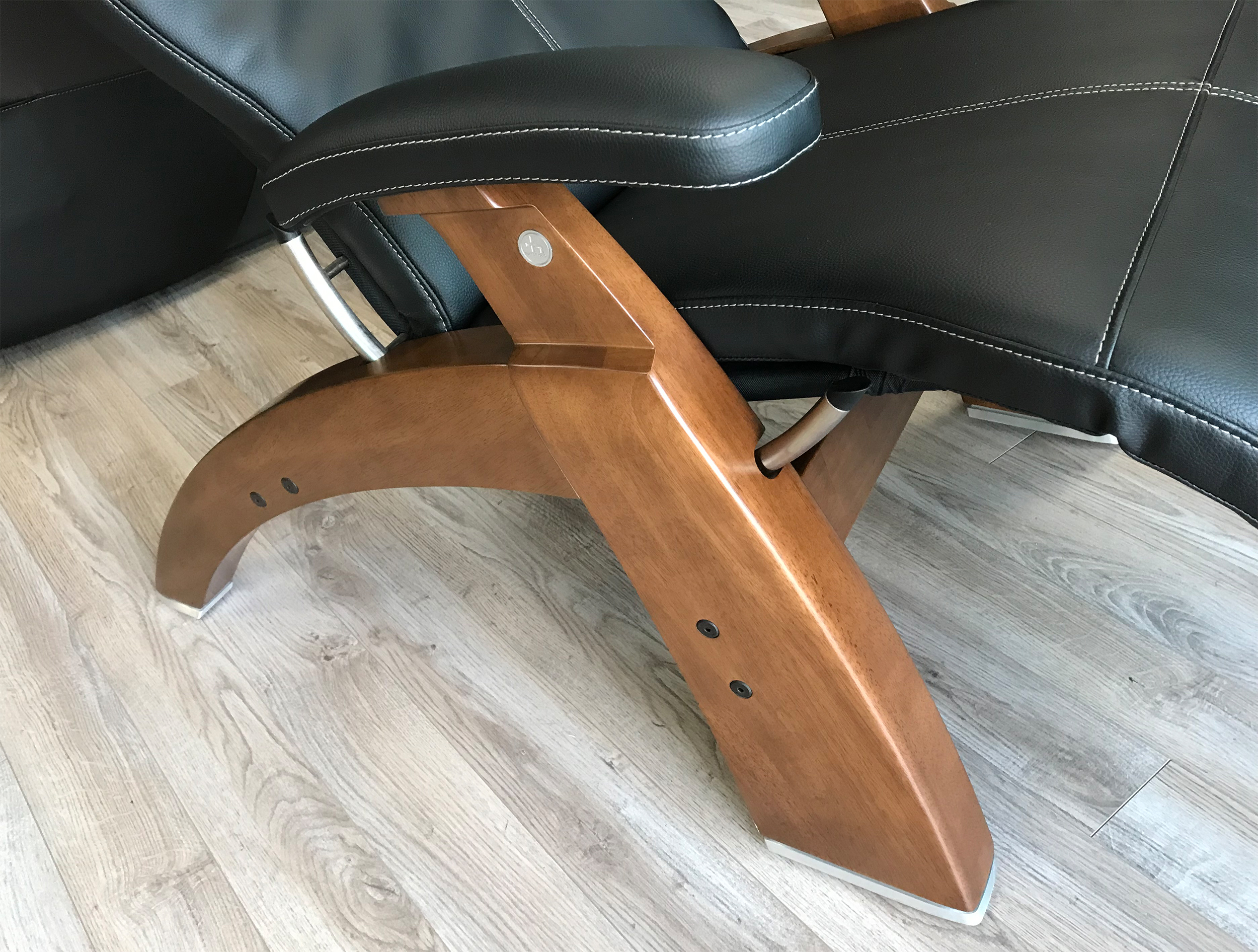 Black Top Grain Leather with a Walnut Wood Base PC-420 Manual Recline Series 2 Perfect Chair Zero Gravity Recliner by Human Touch - Includes a Human Touch 7 Year In-Home Parts and Labor Warranty for New Perfect Chairs. The zero gravity position cradles your back and elevates your legs above your heart, which is the position that doctors recommend as the healthiest way to sit. Easy ingress and egress are achieved with the extended range of motion in the upright position. Exclusive Features Patented Orthonomic™ body frame with built-in lumbar curve. Extra wide legrest provides maximum comfort. The hand carved and finished base is pleasing to the eye, and constructed for years of use. The brake control system is easy to use and extremely reliable. Wedge-shaped, adjustable headrest cushion provides comfort for your head and neck. The adjustable headrest feature allows you to customize the optimum angle of comfort to maximize neck support while reading or watching television (Available on NEW and select Refurbished Chairs). Exclusive guide rail system for smooth recline motion and position control. Refurbished Chairs include a manufacturer's 90 Day Parts Limited Warranty*. New Perfect chairs include a manufacturer's 3 year limited warranty*. For a Power Electric Recline Version please see the PC-600 or PC-610 Omni-Motion Perfect Chair