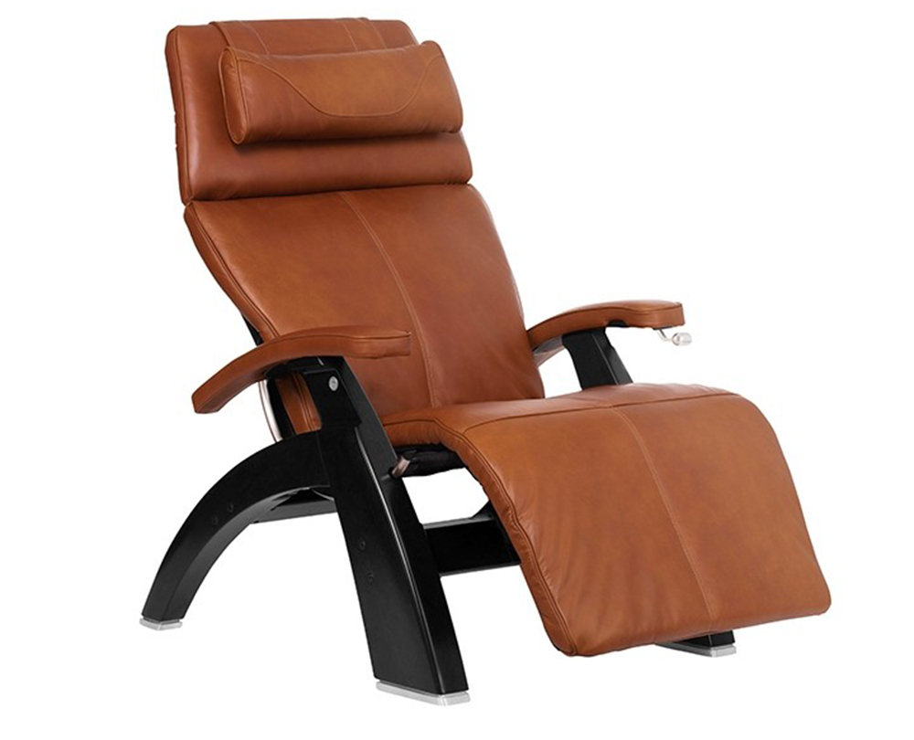 PC-LiVE Cognac Premium Leather Matte Black Wood Base PC-420 Manual Recline Series 2 Perfect Chair Zero Gravity Recliner by Human Touch - Includes a Human Touch 7 Year In-Home Parts and Labor Warranty for New Perfect Chairs. The zero gravity position cradles your back and elevates your legs above your heart, which is the position that doctors recommend as the healthiest way to sit. Easy ingress and egress are achieved with the extended range of motion in the upright position. Exclusive Features Patented Orthonomic™ body frame with built-in lumbar curve. Extra wide legrest provides maximum comfort. The hand carved and finished base is pleasing to the eye, and constructed for years of use. The brake control system is easy to use and extremely reliable. Wedge-shaped, adjustable headrest cushion provides comfort for your head and neck. The adjustable headrest feature allows you to customize the optimum angle of comfort to maximize neck support while reading or watching television (Available on NEW and select Refurbished Chairs). Exclusive guide rail system for smooth recline motion and position control. Refurbished Chairs include a manufacturer's 90 Day Parts Limited Warranty*. New Perfect chairs include a manufacturer's 3 year limited warranty*. For a Power Electric Recline Version please see the PC-600 or PC-610 Omni-Motion Perfect Chair
