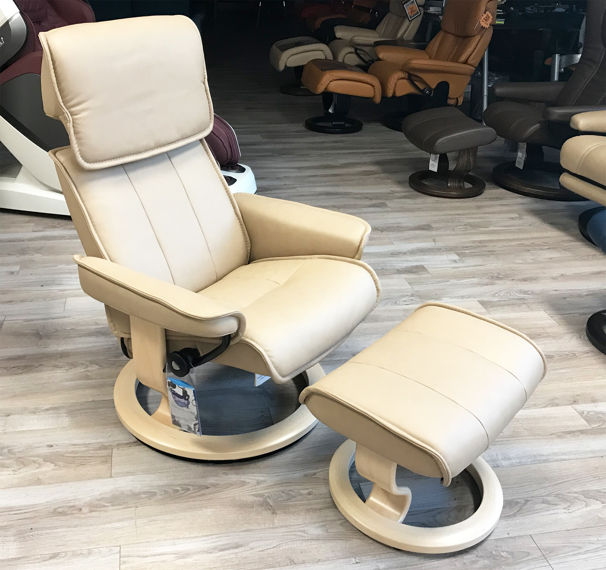 Stressless Admiral Classic Base Paloma Sand Leather Recliner Chair and Ottoman in Natural Wood Stain by Ekornes