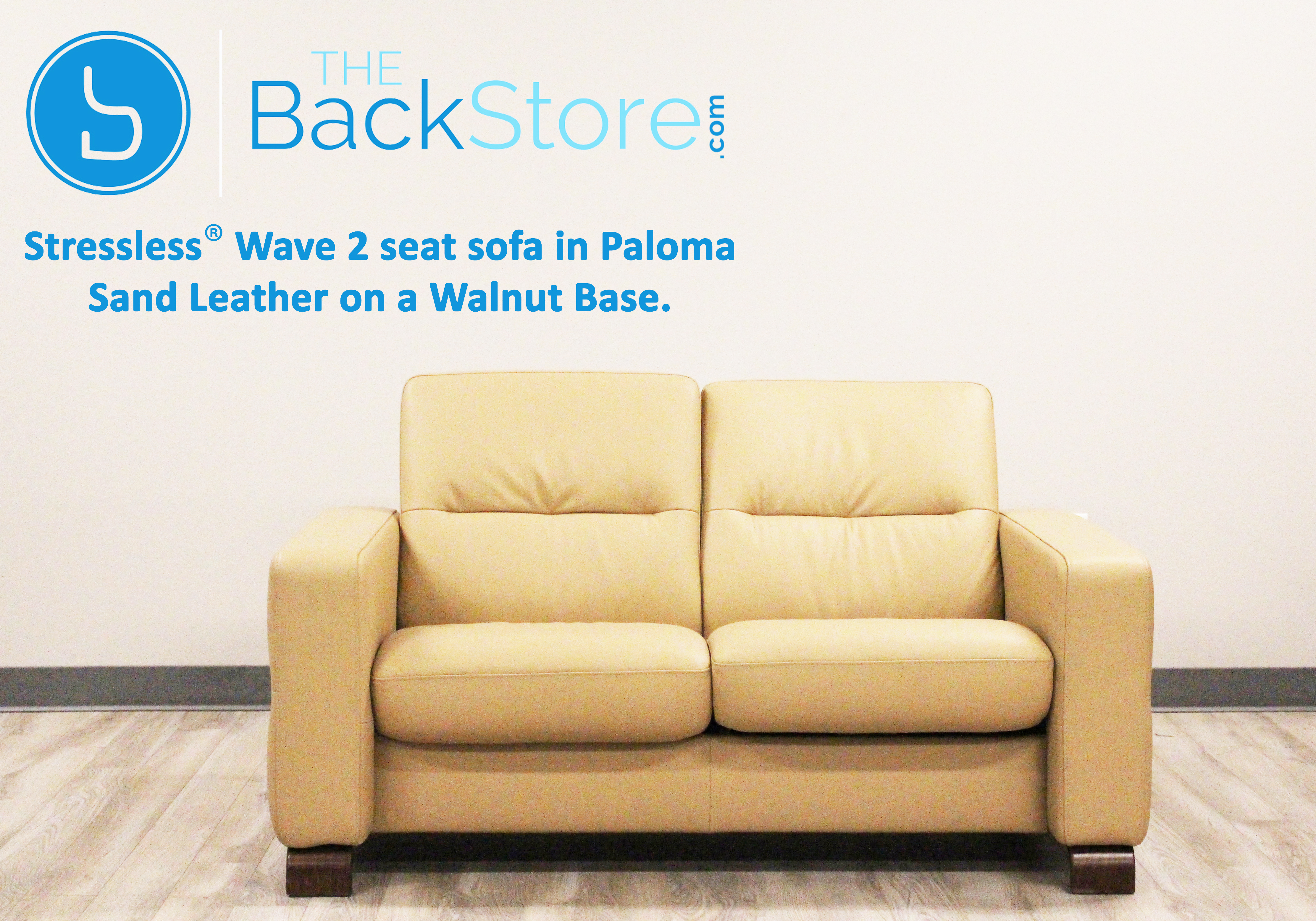 Stressless Wave Loveseat Sofa in Paloma Sand Leather - Named for the gentle waves of the ocean, the Stressless Wave sofa represents a true innovation in comfort technology. The Wave automatically adjusts to each person the moment they take a seat on this amazing sofa. The patented Plus and Glide systems provide the perfect seating angle for truly customized support and the ultimate in individual comfort. Available in a three seat sofa, two seat loveseat, and chair model, the Wave collection also comes with a choice of high or low back. Assembled in the U.S. This item is currently assembled in the U.S. and is available for customized Fast Track shipping in all leather, fabric, wood, and leg combinations.