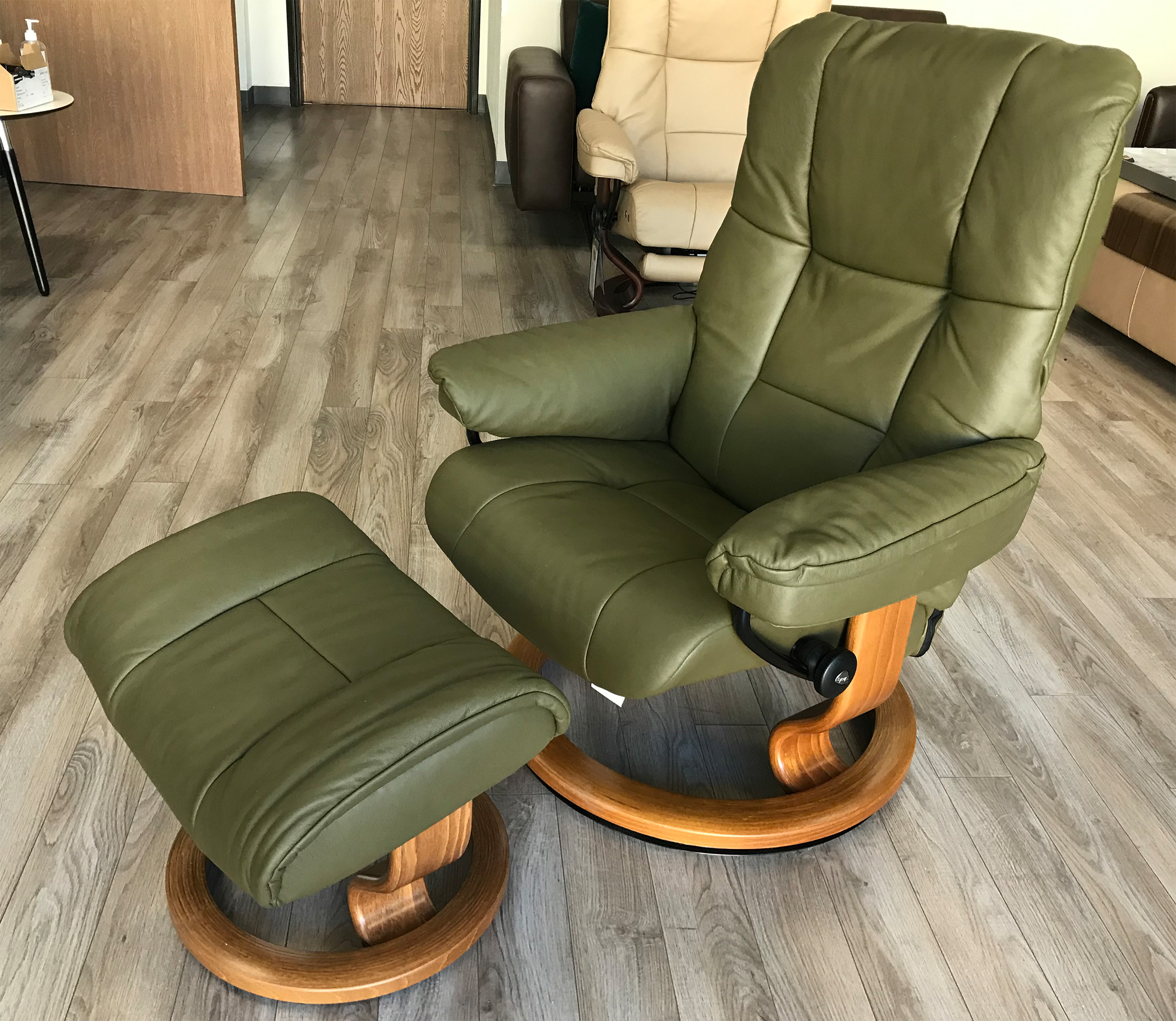 Stressless Mayfair Classic Base Paloma Dark Olive Leather Color Recliner Chair and Ottoman