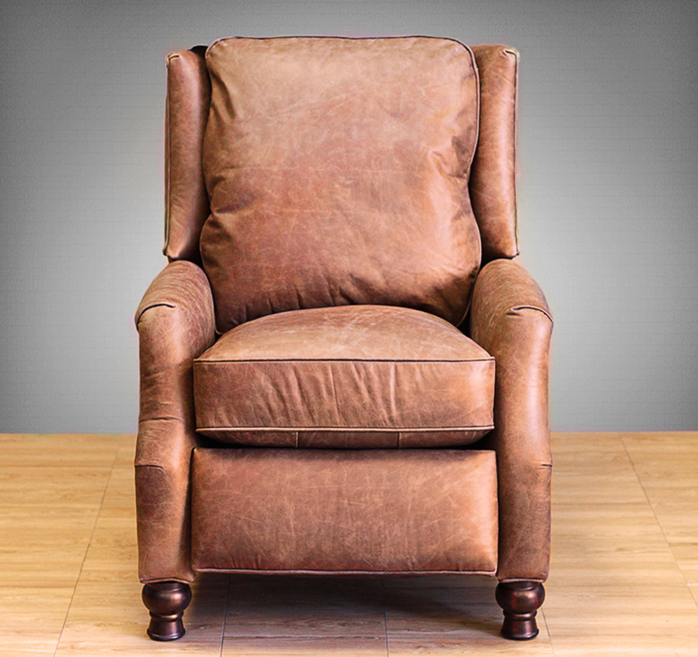 Vintage, classic, traditional or urban. The Ashton II with its sleek, yet sophisticated design provides diverse styling influenced through the leather application, nail head trim and leg color. Top quality Leggett and Platt reclining mechanism is easily activated by leaning into chair back; unit requires only 2.5 lbs of pressure to open. Mechanism has plastic delrin bushings for silent, squeak-free operation and is secured to the recliner with metal bolts and t-nuts, for increased stability and durability. Glued joints with corner blocks, Mechanisms bolted to frame with t-bolts, Five no-sag springs w/ tie wires and under neath Padding on sides and backs of all chairs for safety. One year warranty against manufacturing defects. Five year warranty on mechanisms. Three year warranty on foam and frame parts. Leathers feature luxurious feel and design wrapped in foam and topped with blended down feathers. High resilience 1.8 density seat foam for superior durability and comfort. Hardwood frames with mortise and tenon construction. Colors: |