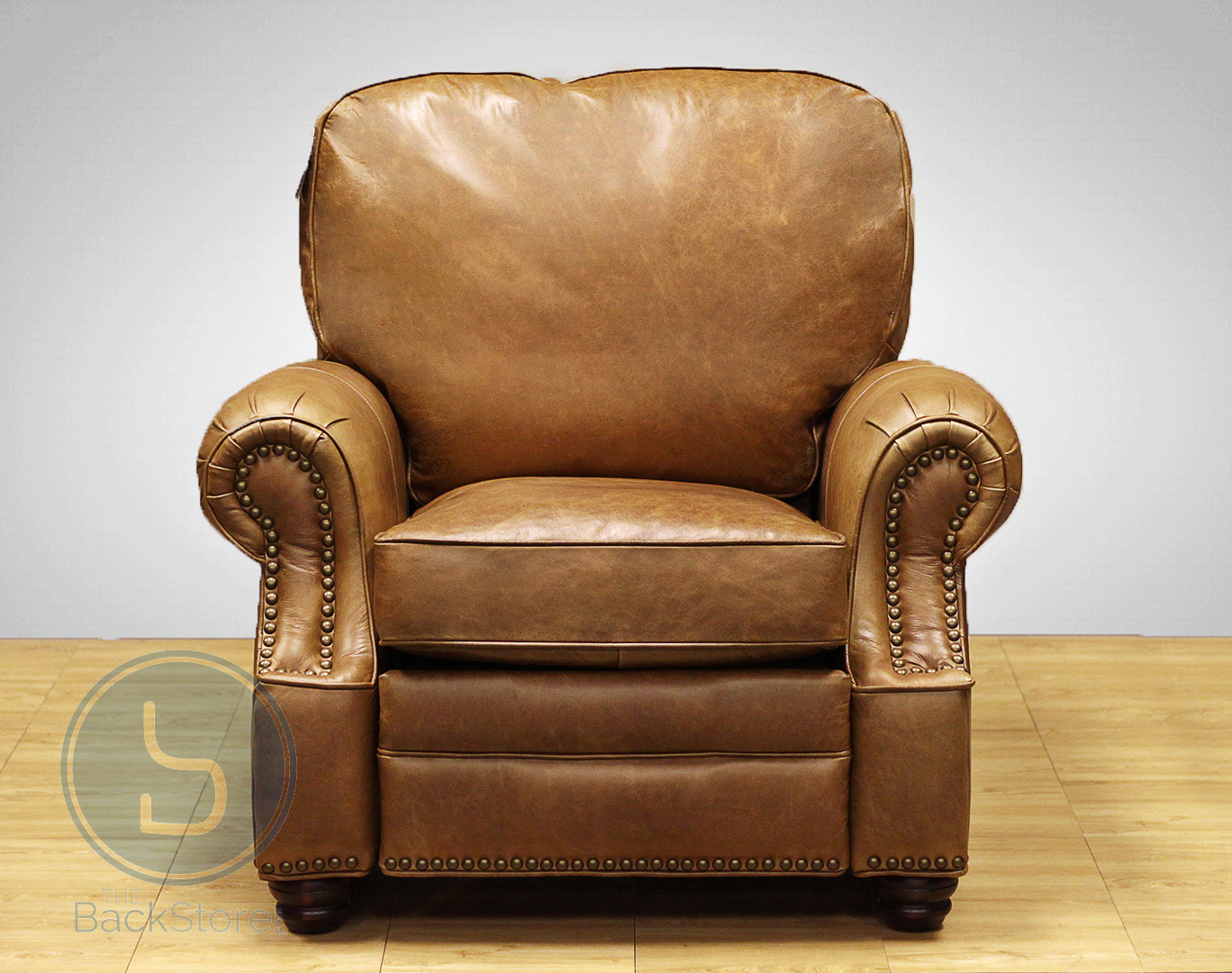 Barcalounger Longhorn II Leather Recliner Lounger Chair - Manual Recline Version - 100% Top Grain Leather all over the chair. If you desire big comfort the Longhorn II is the perfect recliner. The Solid pillow back and rolled arms deliver a classic look with decorative nail head trim and relaxing comfort. Leathers feature distinctive design, luxurious feel and design. Barcalounger's Quality Construction Attached Back and Seat Cushions Hardwood plywood frames, with mortise & tenon construction, glued joints & corner blocks; Promotes Stability, durability and longevity. Leggett & Platt mechanisms are ACTIVATED not operated. Requires only 2.5 lbs of pressure to release Mechanisms, feature delrin bushings wherever metal meets metal. Provides seamless motion, promotes logevity, never squeaks Mechanisms are attached to the frame with bolts and t-nuts; Prevents screw "back-out", increases stability and durability Five No Sag sinous springs w/tie wires; Provides greater seating continuity, maintains shape and comfort level Superior -30 individual pocket coil springs, fully enclosed in fabric wrapped in foam and topped with blended down feathers 1.8 HR (high resiliency) foam; High performance foam promotes stability, durability and longevity Higher than average stitch count per inch, plus, reinforced seams with baseball stitch accents; Enhances seam integrity and increases aesthetic appeal Padding all around the chair (outside arms & back); Highest quality standard in the industry. |
