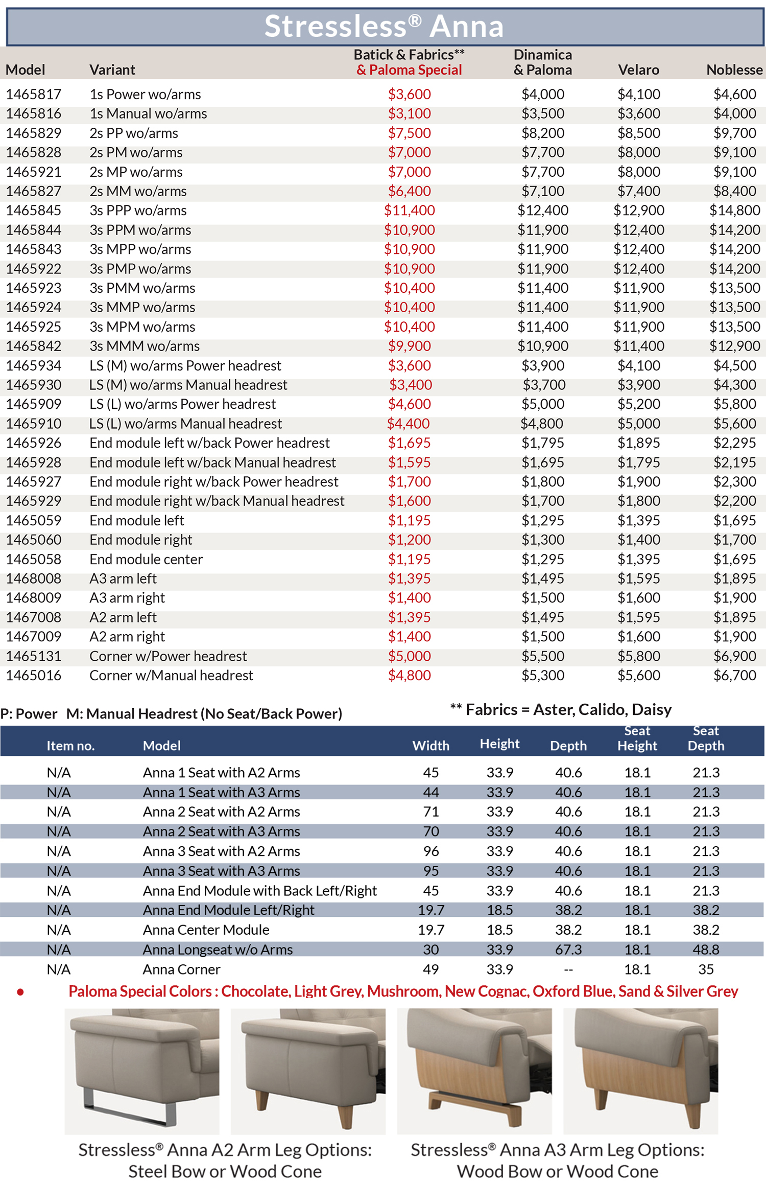 Stressless Anna Upholstered Sofa, Loveseat and Sectional measurements by Ekornes