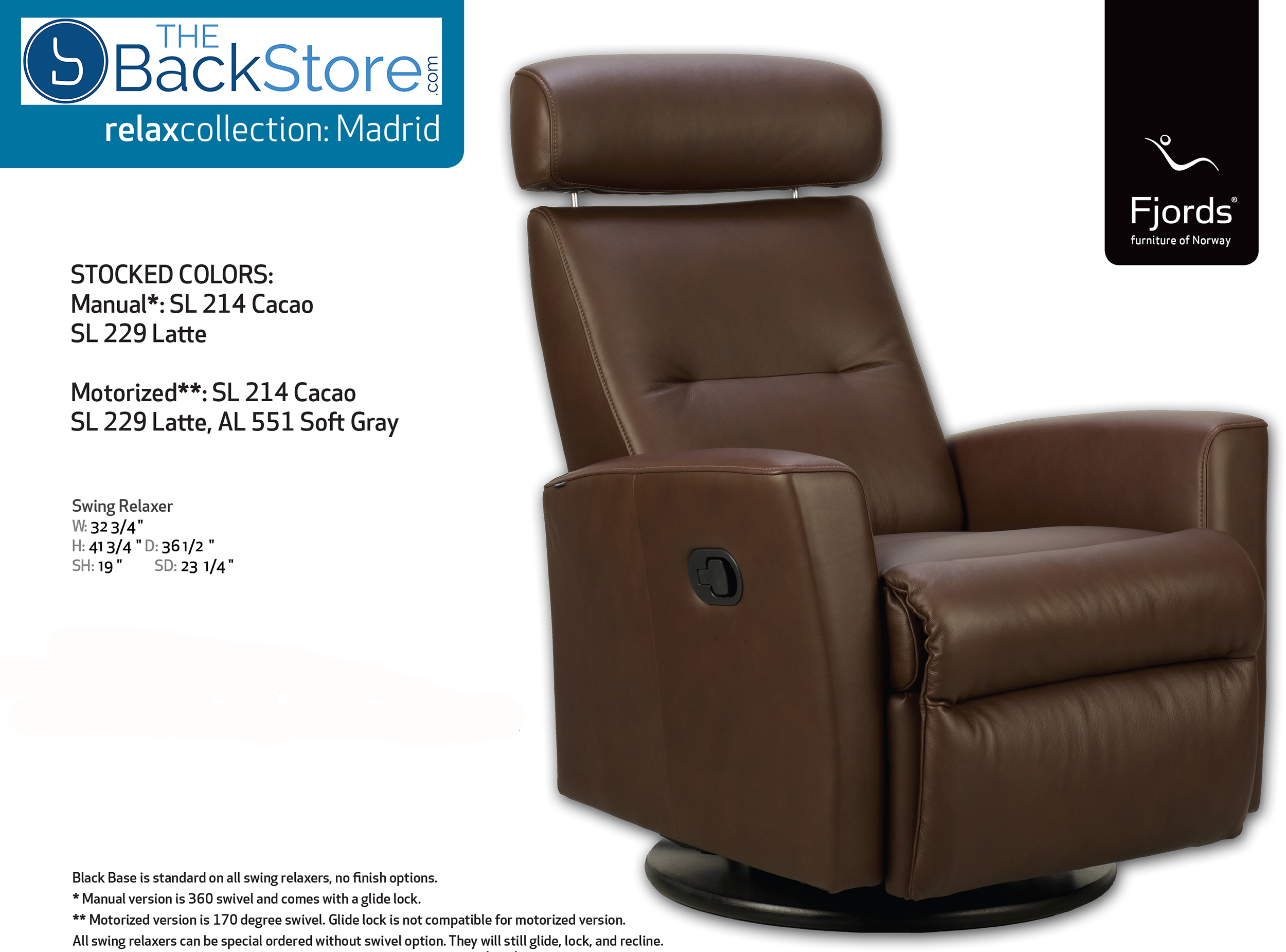 Fjords Madrid Swing Relaxer Recliner has 360 degree rotation for Manual Recline Chairs and approximtely 90 degrees for the Electric Recline Chairs. Available in three grades of Leather - Entry Nordic Line NL Leather, Soft Line SL Leather and the Higher Grade Astro Line AL Leather.