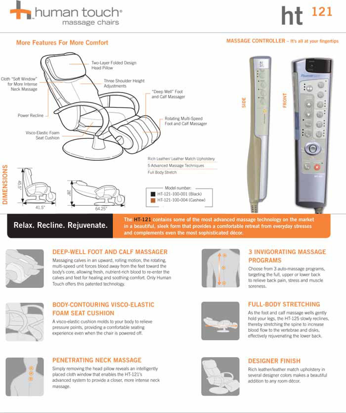 Massage Chair, your comfort, stress and wellness are well under control. Robotic Human Touch Massage Chair Comparison Chart The HT 121 Massage chair offers a combination of our patented Human Touch Robotic Massage Technology™ with a comfortable design and a classy, elegant look, including two choices of durable yet comfortable faux-leather. |