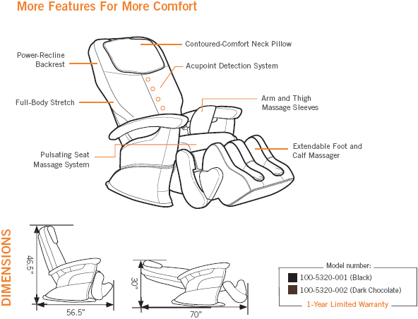Massage Chairs have a 90 Day limited residential use warranty for parts only.