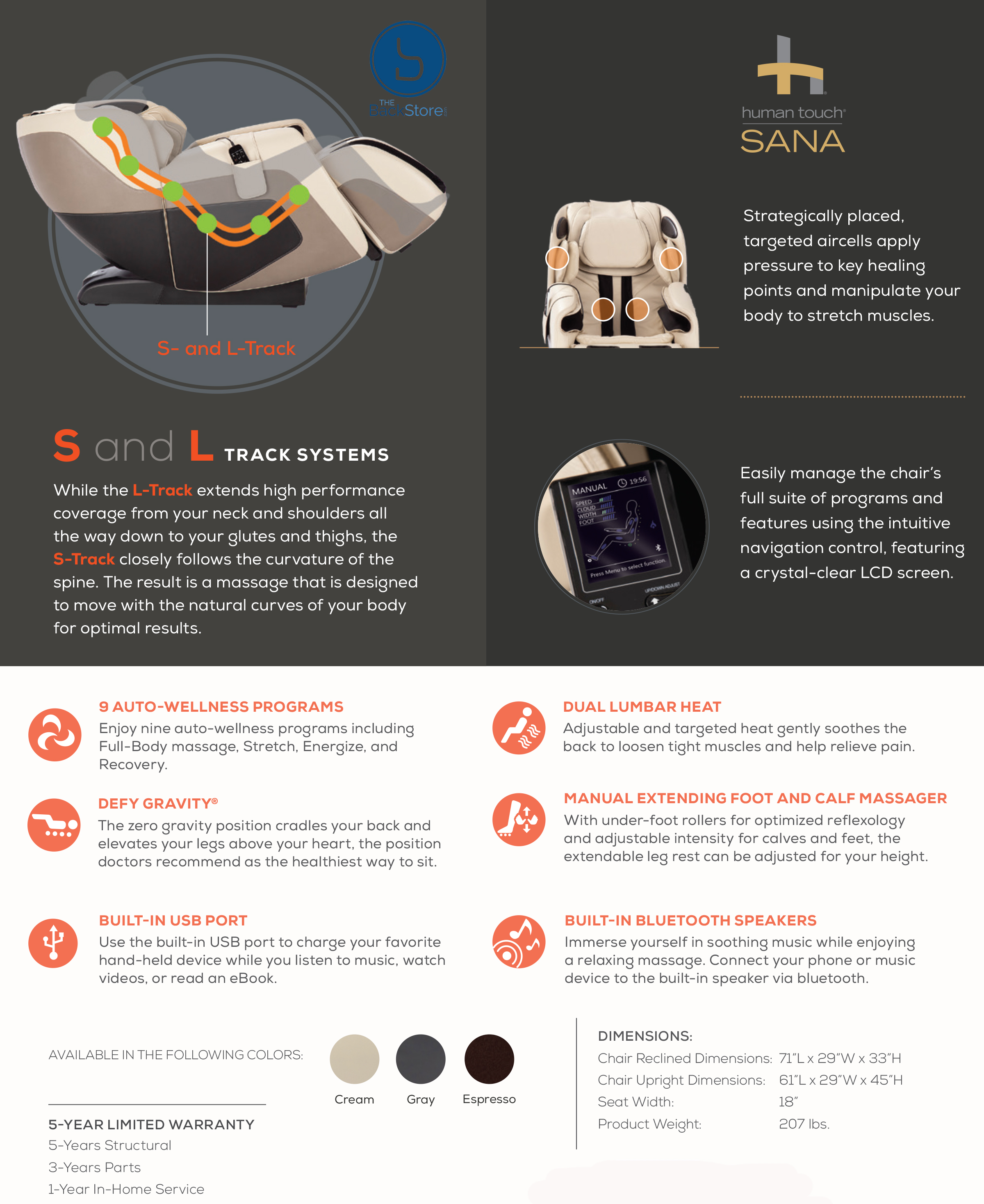 Product Specifications: Human Touch Sana Zero Gravity Massage Chair Recliner