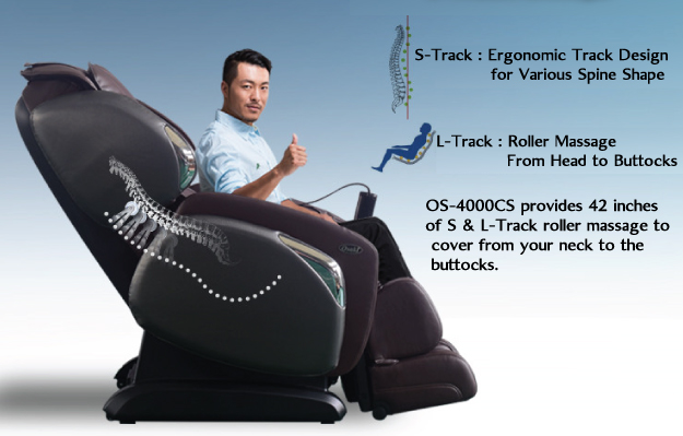 OS-4500 / 4000LS L-Track Massage Robot - The L-Track system massages from the neck, past the gluts, and down to the back portion of the thighs. The track in which the massage heads move is curved to contour the back and gluts area. Space Saving technology (Wall Hugger) only requires 4" from the wall, Lumbar Heat, Adjustable Shoulders and Zero Gravity.