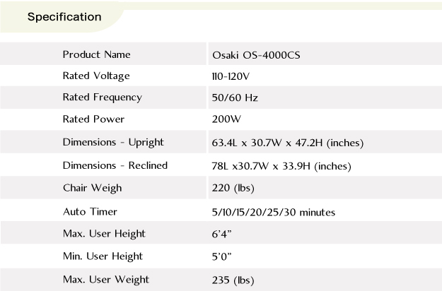 • 6 Unique Massage Programs - The Osaki OS-4000 CS has 6 unique massage styles: Kneading, Tapping, Rolling, Shiatsu, Kneading & Tapping and Kneading & Shiatsu. For the user’s convenience there are 6 pre-set programs to select from, each one goes through all the different massage styles. Each pre-set program is unique because it will focus more one particular massage than the other.