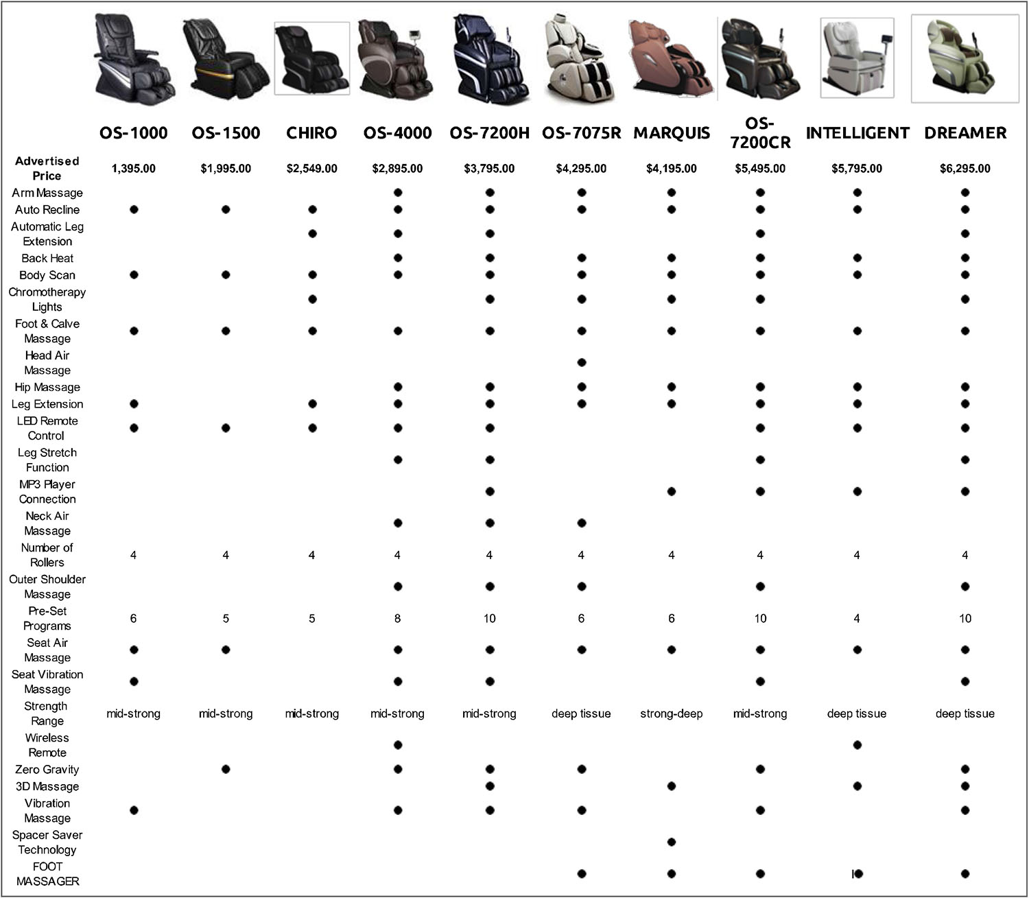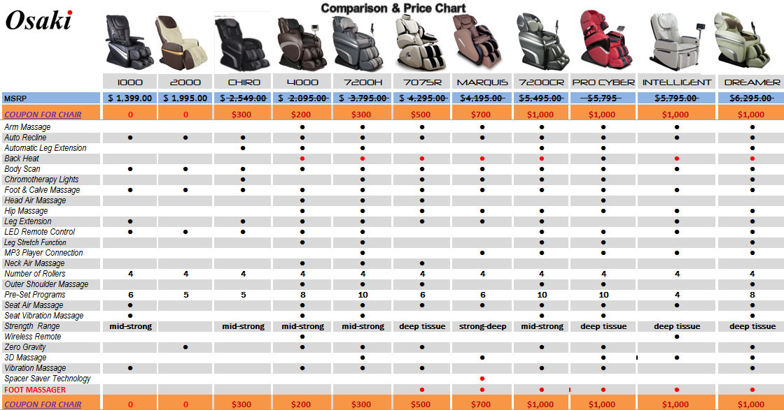 OSAKI MASSAGE CHAIR COMPARISON CHART