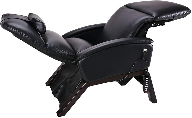 with vegan faux leather, hand-carved wood base, lumbar vibration