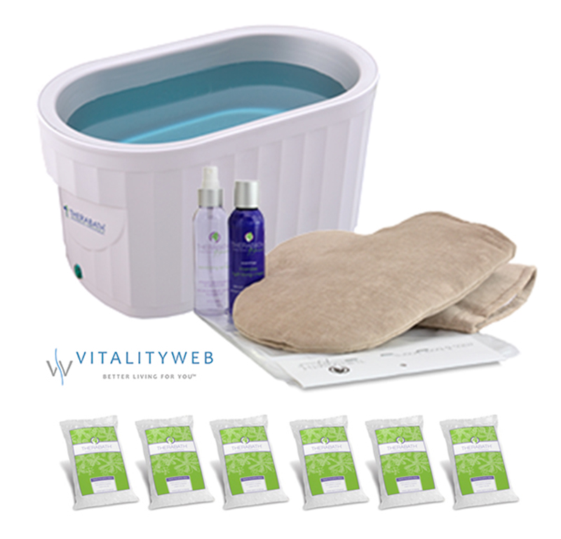 Includes the Therabath, 6 pounds of Therabath Paraffin, 2 Insulated Boots, 100 Mitt Liners, 4oz Sanitizing Spray, 4oz Intensive Hydrating Cream.